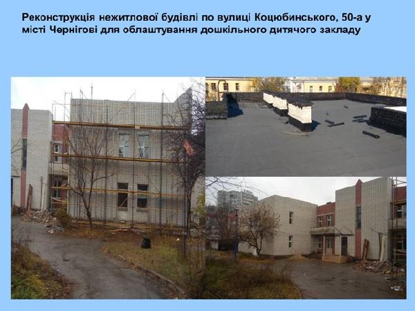 Говоря о реконструкции и ремонте объектов сферы образования области, Леонид Сахневич не мог не остановиться на вопросе реконструкции детского сада по ул. Коцюбинского, 50А в Чернигове. Общая сметная стоимость проекта в ценах текущего года составляет 13,7 млн грн. Источники финансирования в текущем году: средства государственного фонда регионального развития в сумме 8 млн грн и со-финансирование из местного бюджета – 5,2 миллиона.