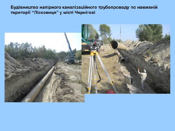 Завершается строительство канализационного коллектора Чернигове. Пропускная способность коллектора позволяет исключить из эксплуатации существующие аварийные участки и осуществить перекачку всех стоков по новому коллектору. Общая сметная стоимость работ составляет более 18 млн грн. На сегодня выполнены работа по строительству участка напорного коллектора длиной 885 метров – стоимость работ составляет 8,7 млн грн.