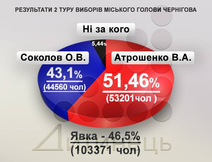 Так, по информации телеканала "Детинец" явка избирателей составила 103 371 человек, что составляет 46.5%. Ни за кого проголосовали 5.44% избирателей, за действующего мэра Александра Соколова 43.1% (44 589 человек), за Владислава Атрошенко - 51.46%, что соотвествует волеизъявлению 53 201 человека. Разница составила 8.36%