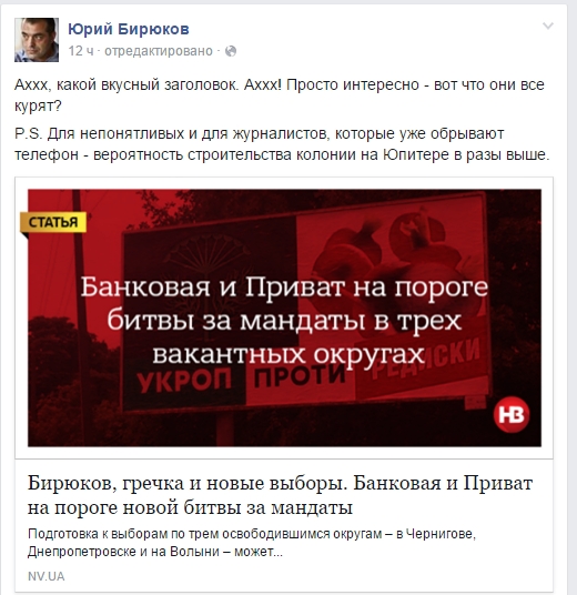 Сам Бирюков после выхода статьи в свет на своей страничке в Facebook написал: