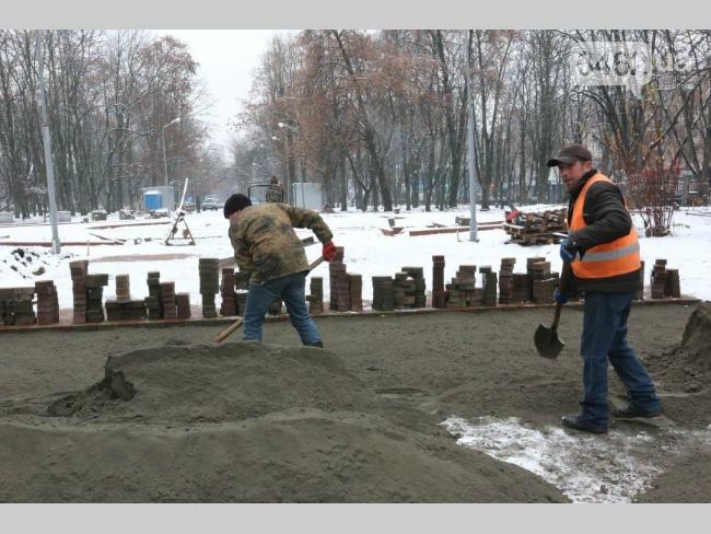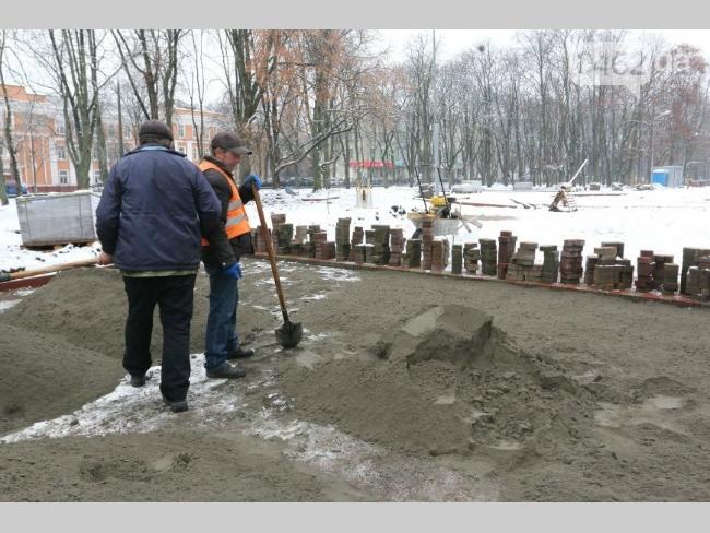 После выходных Чернигов засыпало снегом. Но в понедельник работы по мощению дорог плиткой на бульваре по проспекту Мира продолжились как ни в чем не бывало. Горожане задумались: не повлияют ли погодные условия на качество работы? Оказалось, что используемые материалы позволяют мостить плитку даже при –5°C.