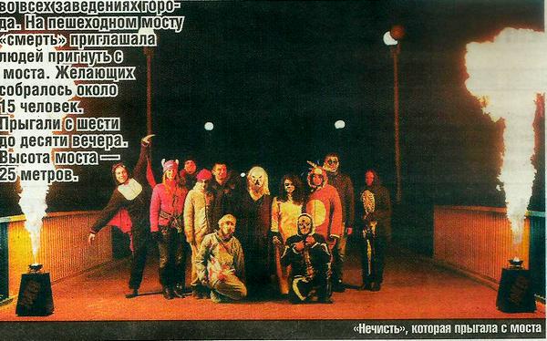 В ночь с 31 октября на 1 ноября по Чернигову гуляла «нечистая сила». Молодежь с разрисованными лицами мертвецов, ведьм, дракул, кощеев, скелетов сидела во всех заведениях города. На пешеходном мосту «смерть» приглашала людей пригнуть с моста. Желающих собралось около 15 человек. Прыгали с шести до десяти вечера. Высота моста 25 метров.