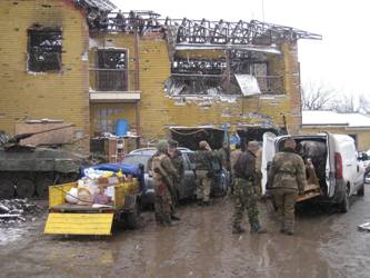 Надалі шлях чернігівських волонтерів пролягав через Піски. В селищі вже більше року не вщухають бої, до позицій зруйнованого Донецького аеропорту – рукою подати! Тут на крайній 18-й точці розташовані позиції добровольчого батальйону ОУН. Умови у воїнів, м’яко кажучи, спартанські, адже за рік активних обстрілів тут вціліло всього кілька будівель.