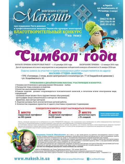 Магазин-студия «Макошь» при поддержке Лиги деловых и профессиональных женщин Чернигова проводит новогодний, благотворительный конкурс на тему: «Cимвол года»