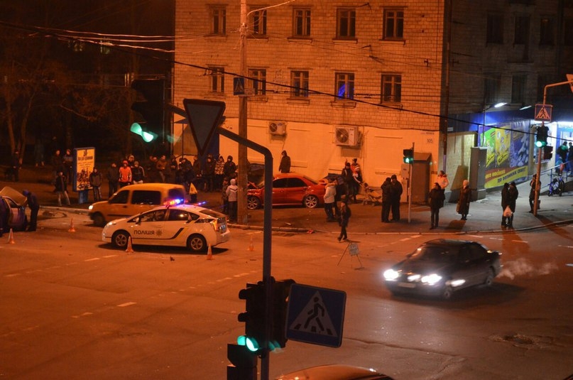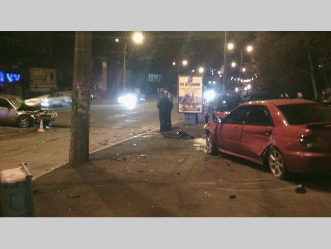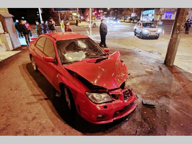Вчера, 27-го декабря, в 18.30 произошло ДТП. Удар был такой сил, что грохот слышали даже на верхних этажах 16-ти этажки, которая размещена на пр-те Победы, 104. Одна из жительниц дома Наталья в тот вечер возвращалась с ребенком из детской студии «Карамелька», за несколько минут до аварии, перешла в том месте пешеходный переход, а в момент, когда уже нажимала кнопку домофона, услышала сильный шум. Женщина вернулась назад, увидев, что посреди перекрестка стоят две развороченные машины - ВАЗ 21112 темного цвета и красный Subaru Impreza. Вызвала «скорую» и ГАИ, медики приехали буквально через 5-7 минут, сразу на трех машинах. Следователь опрашивал очевидцев в течение 4 часов.