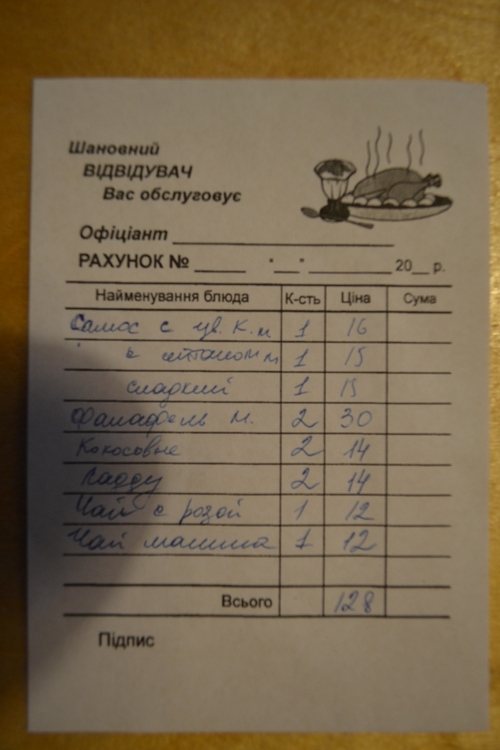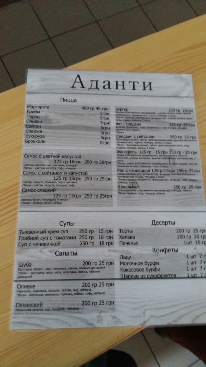 Долго не решаемся, что выбрать, изучая меню. Хочется чего-то необычного, чтобы удивить читателя, ну и ярких вкусовых ощущений. В списке блюд: пицца, бургеры, самосы, десерты, супы. Из салатов – шуба, оливье, пекинский. Ну, оливье без колбасы мы и так пробовали, тыквенный суп тоже много где встречается – берем 3 вида маленьких самосов (маленький – 125 грамм, большой - 250), 2 фалафеля в лаваше и по 2 конфеты каждой – Ладу и Кокосовое бурфи. Из напитков (перечислены на обратной стороне меню) – останавливаемся на чае. Один с розой, второй – с малиной. Чай для «Аданти» собственноручно собирает и пакетирует Жанна Оглобля в одной из деревень Черниговской области.