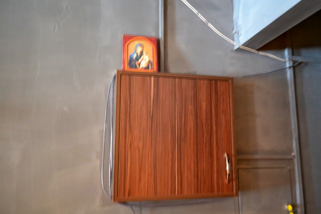 Над шкафчиком возле барной стойки стоит православная икона Божьей матери – ее принесли гости из Славутича на открытие. В воздухе витает запах свежего ремонта, он был сделан буквально за 1 месяц, чтобы вложиться в сроки, хозяин работал, не покладая рук днем и ночью.