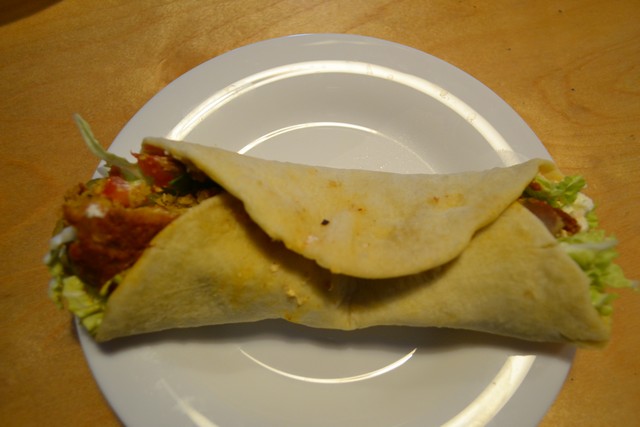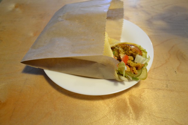 Второе блюдо – «Фалафель» (состоит из лаваша собственного производства, нутовой котлеты, пекинской капусты, огурцов, помидоров, брынзы) – нам он понравился больше, чем самос, да и выглядел более красочно, эстетично и аппетитно, что немаловажно в зимние суровые дни. Подавался на тарелке в бумажном конвертике.