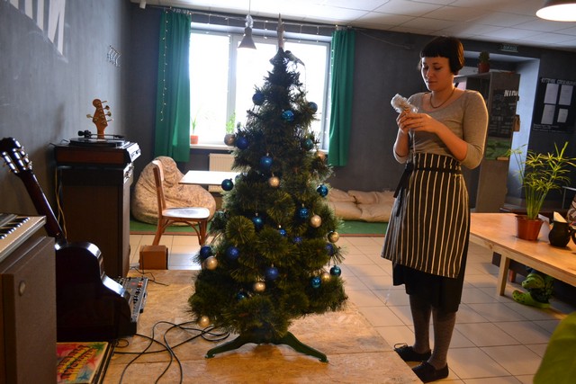 Выбрав блюда, начинаем рассматриваться вокруг. Стены помещения выкрашены в сдержанный серый цвет, под потолком – подвешены светильники плафоны тоже серого цвета. Слева под стенкой и по центру светлые деревянные столы с деревянными же стульями и лавками. У окна несколько кресел-мешков, на противоположной стене от барной стойки мини-сцена с микрофоном и елка, украшенная шариками серебристого и синего цвета. Возле входа – полка с ретро-книгами. На столах глиняные чайники и кувшины темно-серого цвета, цветы в вазонах. Несколько выбивается из общего стиля коричневый диван. Барная стойка покрашена в спокойный зеленый цвет.