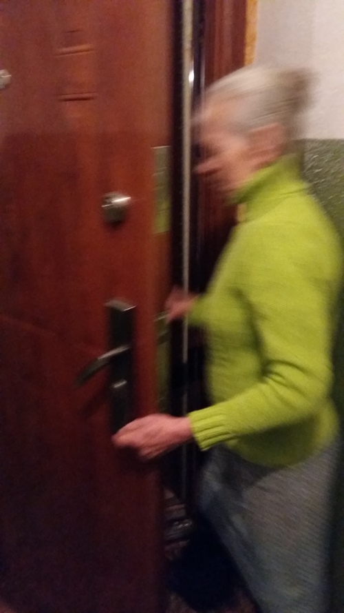 Спускаемся на третий этаж, звоним в дверь к Евгении Кислой. В ответ тишина, звонок, судя по всему, отключен или сломан. Стучим. На пороге появляется худенькая седоволосая женщина с жалобным взглядом встревоженных карих глаз в светлом зеленом свитере и серой юбке. Очень тихо, что едва можно разобрать, она повторяет, что ей очень стыдно и что Руслана увезли в Халявин, он больше не приедет, и тут же скрывается в квартире.