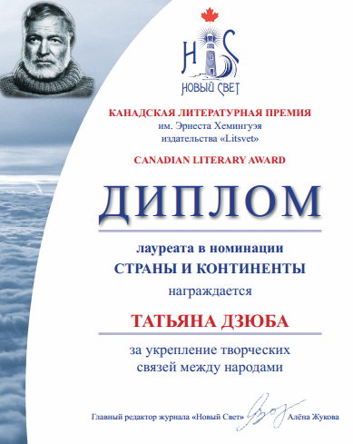 Приятная новость пришла из Канады — известные писатели и журналисты из Чернигова Татьяна Дзюба (Татьяна Анатольевна также и научный работник, доктор наук по социальным коммуникациям) и наш коллега из газеты «Деснянская правда» Сергей Дзюба недавно стали лауреатами почетной международной награды — премии имени Эрнеста Хемингуэя в номинации «Страны и континенты» за укрепление творческих связей между народами. Основатели этого престижного отличия — канадское издательство «LitSvet» и известный журнал «Новый Мир».
