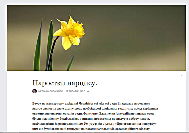 Ближе к обеду от него поступило сообщение с ссылкой на текст, в заключительной части которого Александр Мельник написал: «публично предлагаю Владиславу Атрошенко волонтерскую помощь». Над текстом стоял цветок нарцисса…