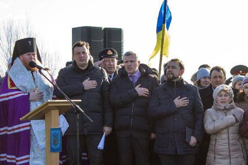 Владика Євстратій, Валерій Куліч, Арсен Дідур, Володимир В’ятрович. Гімн України. Фото ОДА
