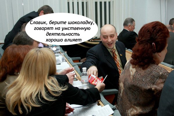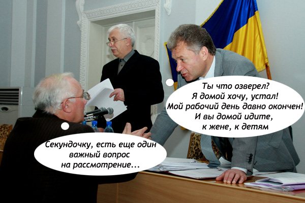 В этот раз очередная сессия горсовета прошла довольно мирно и спокойно. Депутаты решили и одобрили множество вопросов полезных для города и его граждан. Правда, были и некоторые курьезы. Так, например, народные избранники отдали 32 голоса, за то, чтобы вернуть многострадальную Екатериненку назад археологическому заповеднику. Ну и что с того, что решение сие не имеет юридической силы? Зато каноническим бабушкам было приятно. А мы в свою очередь не станем отягощать вас остальными подробностями того, что происходило в сессионном зале, на Магистратской, 7. А предлагаем вашему вниманию традиционный юмористический репортаж с событий.