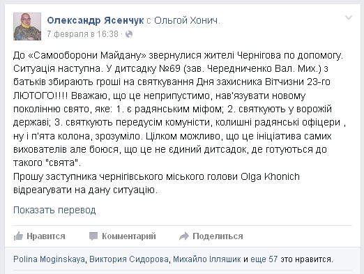- До мене, як до помічника депутата Верховної Ради звернулася у Фейсбук громадянка міста Чернігова, яка розповіла в повідомленні про те, що її онуку, котрий ходить в дитячий садок №69, пропонують взяти участь у святкуванні 23 лютого і збирають якісь кошти. Я через Фейсбук звернувся до заступника міського голови з проханням розібратися в ситуації. І якщо так, то відповісти на питання, чому це відбувається.