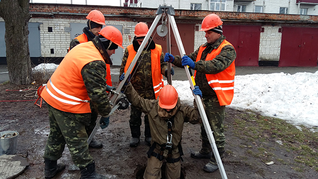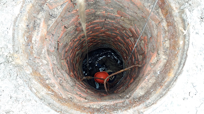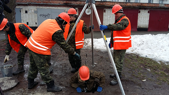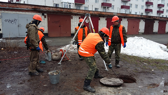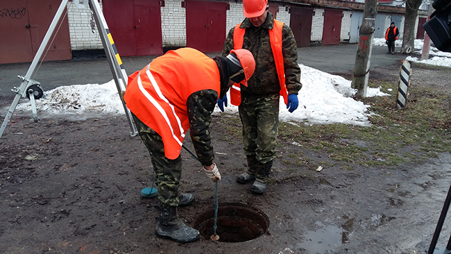 Только после тщательной проверки загазованности колодца туда спускают специалиста для очистки и подают ему инструмент