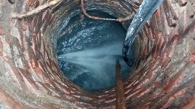 После прочистки колодец промывается под высоким давлением воды, причем промывка идет в направлении "против течения"