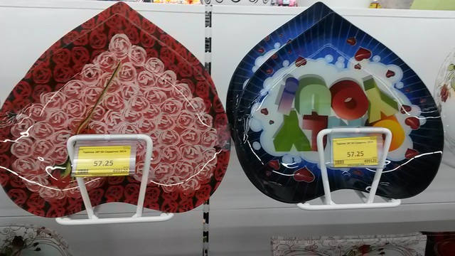 В магазинах к празднику делают скидки на товары, к 14 Февраля приурочены многие акции. Даже в отделе посуды можно найти вот такие тарелки в виде сердец или с признаниями в любви.