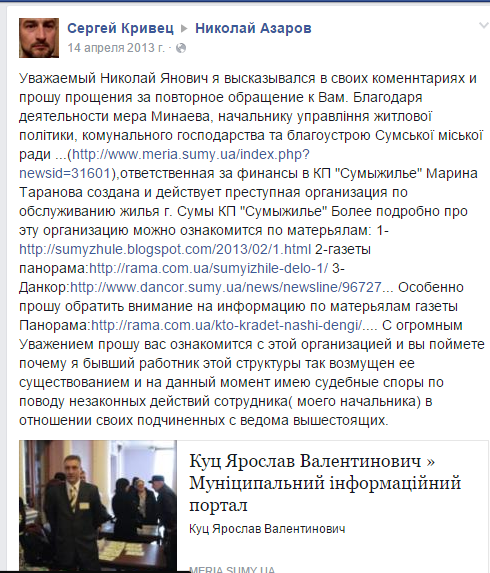 Ще в 2013-му році мешканці Сум зверталися до пана Азарова зі скаргами на діялність Марини Таранової в КП "Сумижитло"