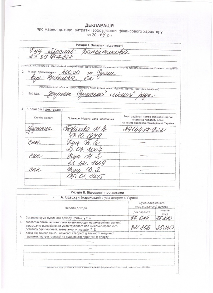 На сайті партії "Рідне місто" досі лежить декларація Ярослава Куца за 2014-й рік. Що цікаво, дані в ній дещо відрізняються від декларації за 2015-й рік.