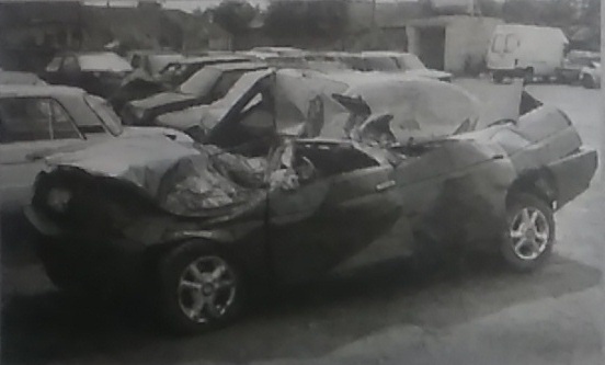 17 июня 2006 г. в 23.00 в г. Чернигов водитель автомобиля Альфа-Ромео (номерной знак 469-77 ММ) двигался на очень большой скорости ( о чем говорит боковой юз автомобиля - 80 м), пребывая за рулем в нетрезвом состоянии, по улице Кольцевая со стороны Александровки в сторону перекрестка Кольцевая - Михалевича, не справился с управлением, вследствие чего автомобиль совершил наезд на придорожное дерево. Водителя спасло только то, что он вылетел через лобовое стекло. То, что осталось от автомобиля, вы можете видеть на фото. Водитель получил тяжелые телесные повреждения, сотрясение мозга и компрессионный перелом шейного позвоночника.