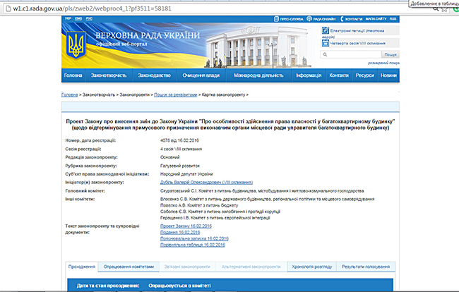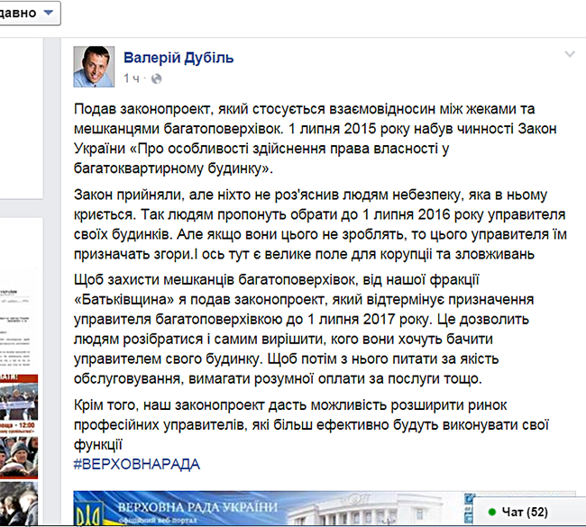 «Подав законопроект, який стосується взаємовідносин між жеками та мешканцями багатоповерхівок. 1 липня 2015 року набув чинності Закон України «Про особливості здійснення права власності у багатоквартирному будинку». Закон прийняли, але ніхто не роз'яснив людям небезпеку, яка в ньому криється. Так людям пропонуть обрати до 1 липня 2016 року управителя своїх будинків. Але якщо вони цього не зроблять, то цього управителя їм призначать згори.І ось тут є велике поле для корупціі та зловживань Щоб захисти мешканців багатоповерхівок, від нашої фракції «Батьківщина» я подав законопроект, який відтермінує призначення управителя багатоповерхівкою до 1 липня 2017 року. Це дозволить людям розібратися і самим вирішити, кого вони хочуть бачити управителем свого будинку. Щоб потім з нього питати за якість обслуговування, вимагати розумної оплати за послуги тощо. Крім того, наш законопроект дасть можливість розширити ринок професійних управителів, які більш ефективно будуть виконувати свої функції», – написал депутат в социальной сети Фейсбук.
