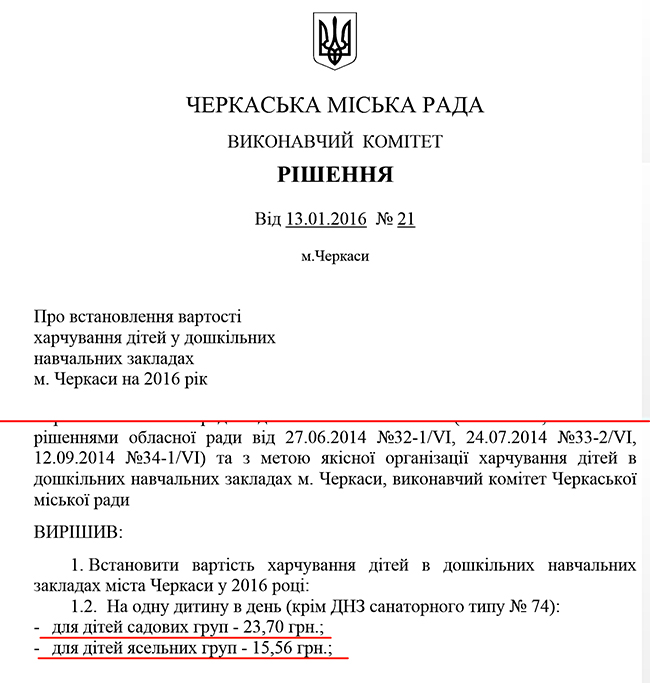 В Черкассах в 2016 году стоимость питания детей в ДНЗ составит 15,56 грн и 23,7 грн соответсвенно.