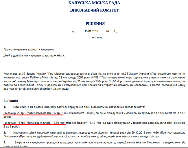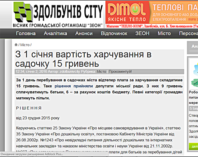 С 1 января 2016 года стоимость питания в ДНЗ г. Здолбунов Ровненской области подняли до 15 грн.