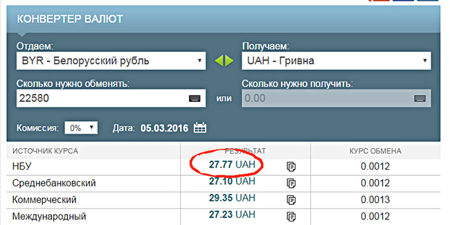 По курсу обмена НБУ на 5 марта 22 580 белорусских рублей – это 27,77 грн.