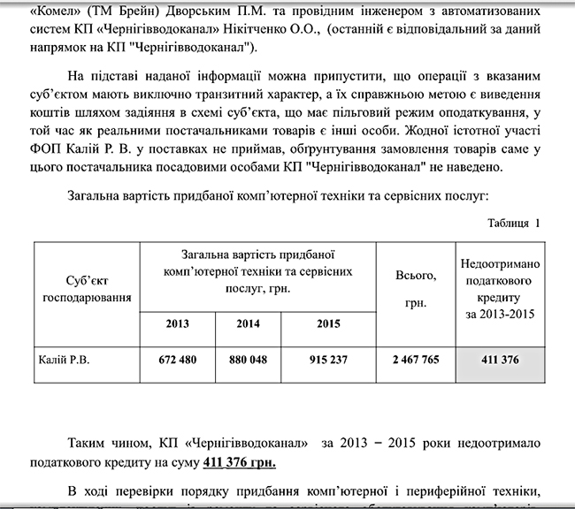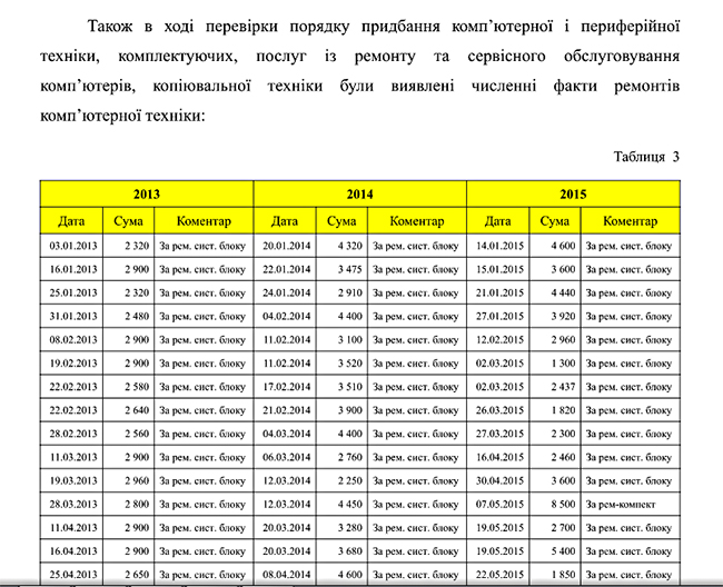 В вопросе ремонта и обслуживания компьютерной техники также были выявлены нарушения. Ремонт, по словам городского головы, проводился различными предприятиями Чернигова, а деньги пропускались через «фирму-прокладку». Причем стоимость товаров и услуг была существенно завышена. В акте не говорится о суммах злоупотреблений, но общая сумма, заказанных за три года у ФОП услуг составляет более 570 тыс грн.