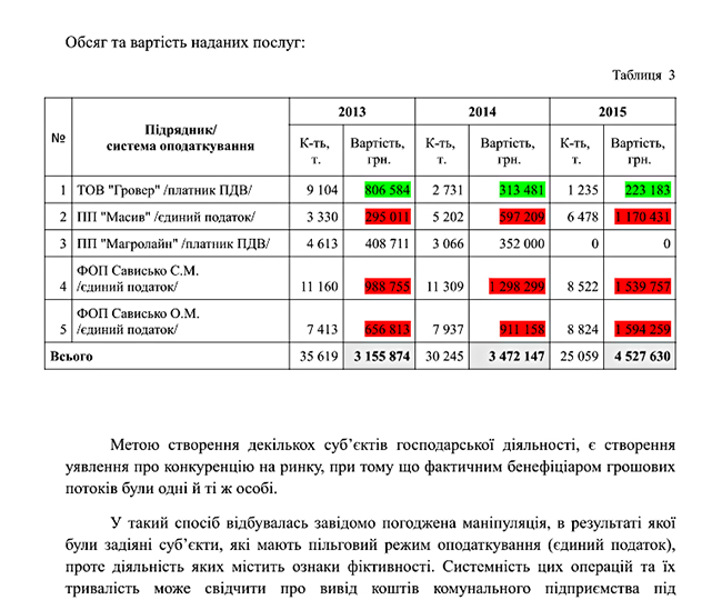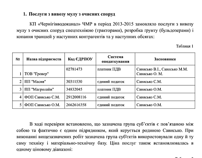 Атрошенко заявил, что вывоз ила с предприятия осуществляло несколько частных структур, которые, как выяснилось при проверке, фактически принадлежали одним и тем же лицам и использовали одну и ту же технику. Причем стоимость услуги, как для фирм-плательщиков НДС, так и для предприятий, работающих на едином налоге была практически одинаковая. По выводам комиссии, в результате таких договоров КП «Черниговводоканал» недополучило налогового кредита на сумму более 1 млн грн.
