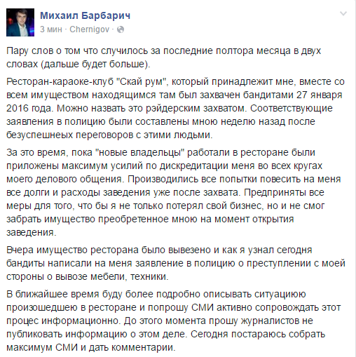 Сам факт преступления нам подтвердил в телефонной беседе собственник заведения – черниговский предприниматель и политик (баллотировался этим летом по 205-му округу в качестве одного из кандидатов) Михаил Барбарич. По его словам, в краже он подозревает людей, причастных к работе заведения, а также назвал произошедшее не просто кражей, а рейдерским захватом. В данный момент он проводит собственную проверку.