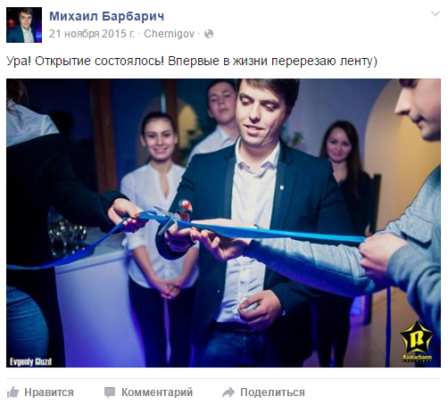 Михаил Барбарич поделился 21 ноября 2015-го на своей страничке в Фейсубк радостным событием открытия ресторана