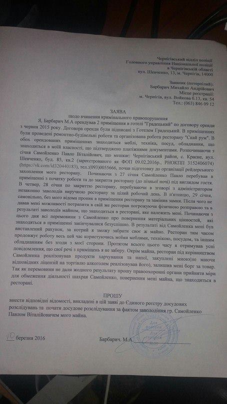 - Я даже не прогнозировал, что все дойдет до такого. Все решалось в частном порядке, в процессе переговоров. Я предлагал Самойленко компенсировать понесенные мной расходы и убытки, а также возможный выкуп заведения. Он же все это время пользовался моим имуществом, не платил людям зарплату, этот человек просто зашел и заработал денег. На момент, когда меняли замки, на мне еще был оформлен договор аренды, на нем – еще не был. За все это время у меня были попытки забрать свое имущество, они заключались в том, что я вел переговоры с Павлом и с непосредственными представителями гостиницы. Также я выставлял счет Самойленко за аренду, но он был проигнорирован. Убытки состоят еще и в том, что в заведении, пока там пребывал Павел реализовывали товар (продукты и спиртное), который закупался еще мною, и на который поставщики выставили счет, хотя, по сути я уже не имел к нему доступа. Поэтому я считаю, что Самойленко попытался повестить на меня еще и долги.