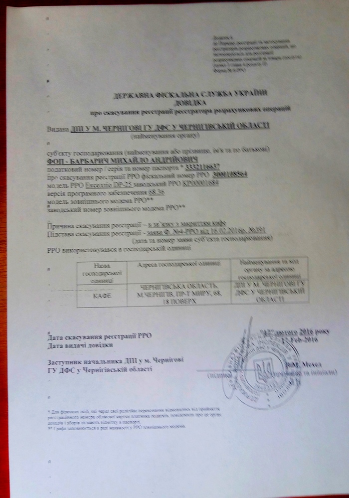 Справка о закрытии кафе по адресу пр-т Мира, 68, 18 этаж, заявитель - ФОП Барабарич Михаил Андреевич