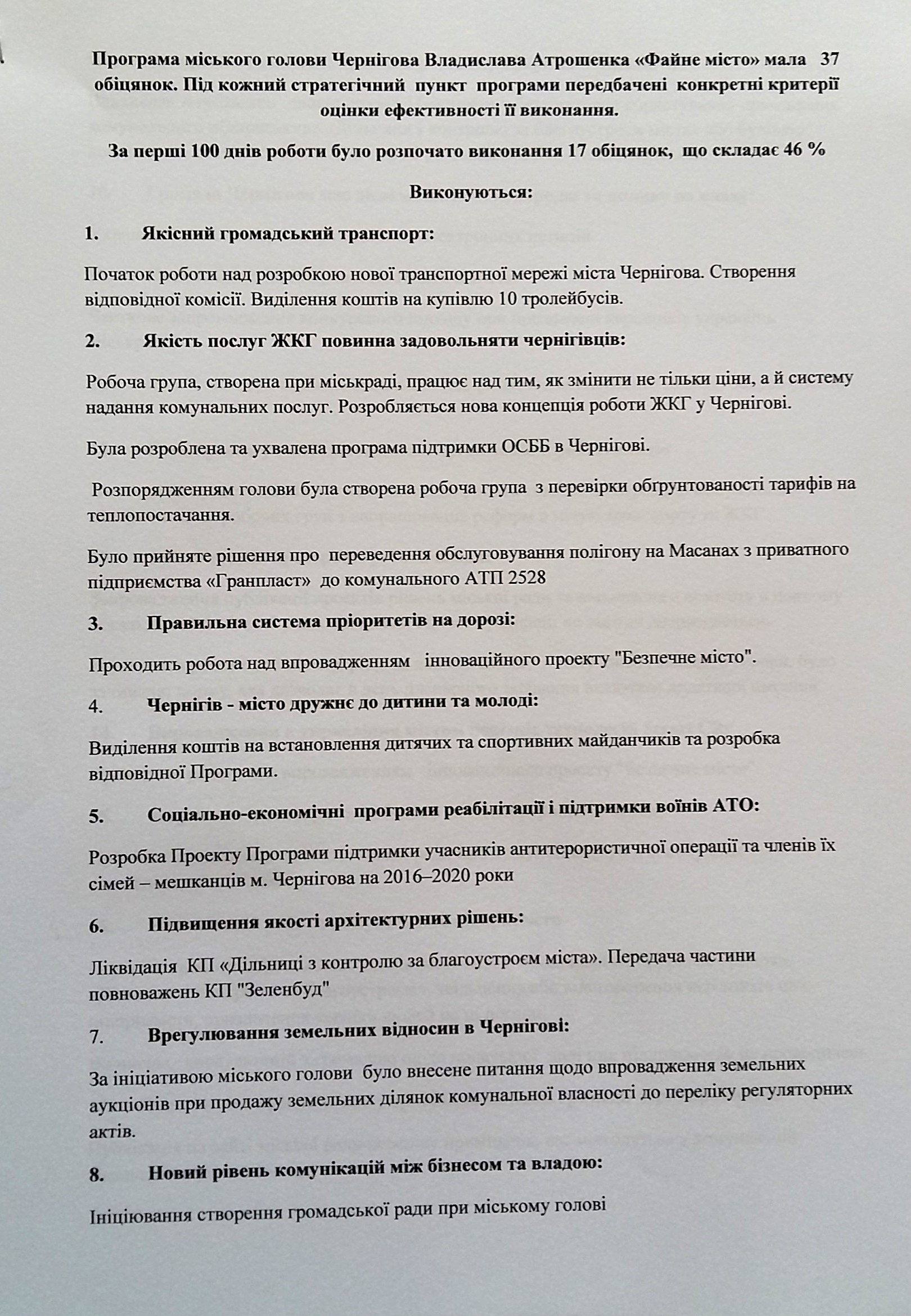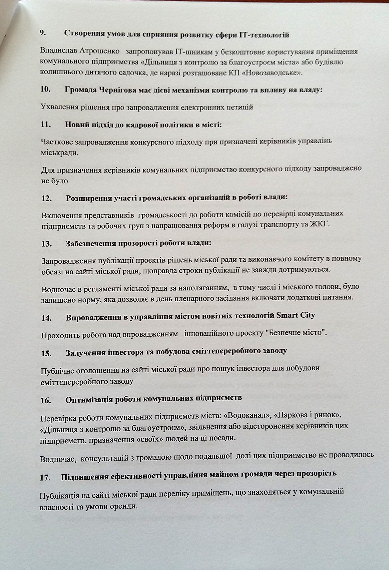 Не будем рассматривать все пункты обещаний. Оценим только п.8 – «Создание совета при городском голове», который не требует дополнительных решений или финансовых вливаний. Уже минуло 100 дней, а в городе никто так и не знает конкретной даты создания этого консультативного органа! Что мешает Владиславу Атрошенко сформировать его состав и провести первое заседание, чтобы в пункте обещаний поставить отметку «Выполнено» – остается загадкой.