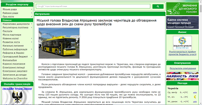 Сегодня, на официальном сайте городского совета появилось сообщение о том, что «Міський голова Владислав Атрошенко закликає чернігівців до обговорення щодо внесення змін до схеми руху тролейбусів». Жителям города предлагают не открытое обсуждение ситуации на транспорте, а просто рекомендуют направлять свои пожелания и предложения на электронную почту управления транспорта и связи. Только вот узнает ли общественность о предложениях черниговцев?