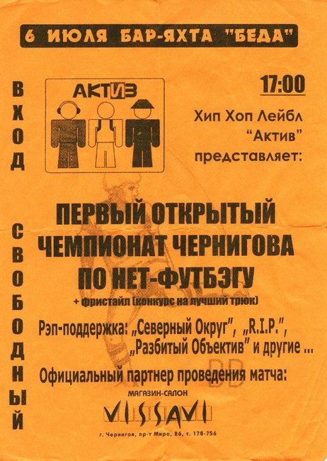 Действовали по принципу "ищите - найдете, стучите - и вам откроют". Стучали... Им открыли... Выступить в роли спонсора согласилась пара-тройка черниговских коммерческих фирм. Навстречу пошла и администрация кафе-бара "Яхта "Беда", предоставившая свою территорию для проведения фестиваля. Затея обещала быть весьма и весьма интересной: планировались соревнования по нет-фут-бэгу, конкурс на название лучшего реп-исполнителя, выступление танцевального коллектива "Soul Jazz".
