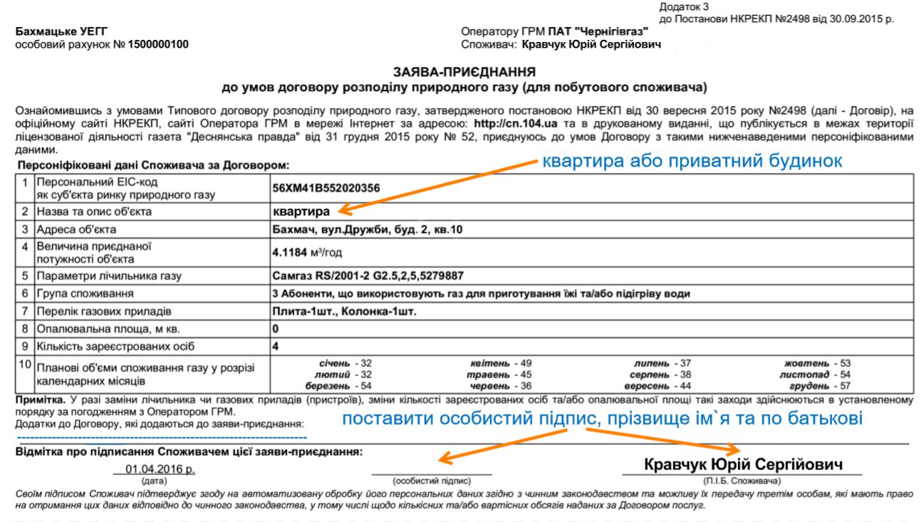 Подтверждением присоединения к условиям договора может быть оплаченный счет ПАО «Черниговгаз» за услуги распределения и/или потреблении газа после получения письма с заявлением-присоединением. Если потребитель не желает присоединяться к договору, он не имеет права использовать газ с газораспределительной системы и должен подать в «Черниговгаз» письменное заявление о прекращении распределения газа на его объект.