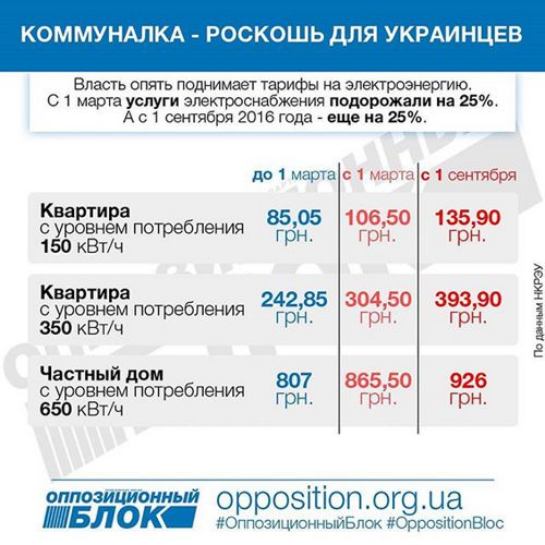 «На початку квітня люди заплатять за електроенергію за новими тарифами на чверть більше. Тепер вони складають від 57 копійок до 1,56 грн за кВт, в залежності від кількості споживаної електроенергії. В середньому лічильник для 2-кімнатних квартир накручує на місяць більше 100 кіловат. В такому випадку один кіловат коштуватиме 99 копійок. Якщо порахувати, що середньомісячні витрати електроенергії у сім'ї з трьох осіб становить близько 150-200 кіловат, то в нових платіжках тільки світло обійдеться людям приблизно в 140-190 гривень. Це - майже п'ята частина мінімальної пенсії. А якщо додати сюди ще й плату за опалення, газ, водопостачання, то загальна сума перевищить мінімальну зарплату»,- зазначає політик.