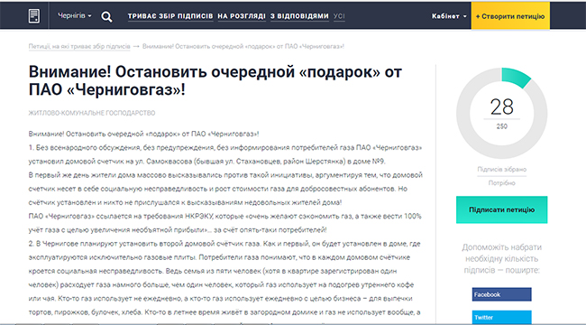 И хотя в Чернигове домовой счетчик газа пока один, и тот еще не введен в эксплуатацию, петиция к местной власти, направленная против установки домовых приборов учета была зарегистрирована 6 апреля. Сама идея установки домовых счетчиков вряд ли исходит от ПАО «Черниговгаз», но в петиции нововведение называют «подарком» именно местной газораспределительной компании. Примечательно также, что автором протестной петиции является Тимошенко, правда, не Юлия Владимировна, а Людмила Николаевна.