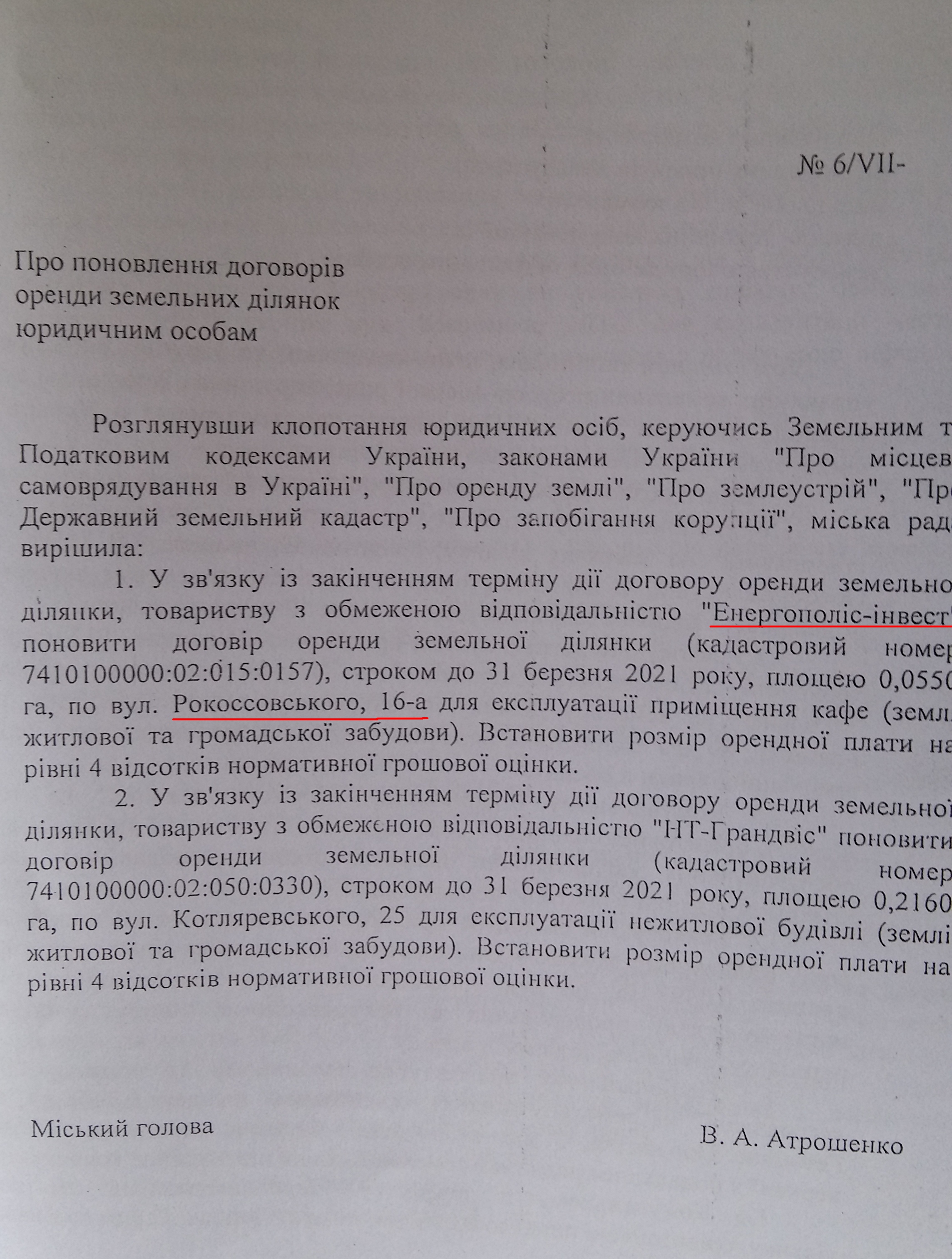 На цій же сесії дали добро на подовження оренди земельної ділянки до 31 березня 20121 року для «Енергополіс-інвест». Ділянка знаходиться за адресою Рокосовського, 16-а - де розміщені піцерія "Марконі" та один з офісів компанії ОСНОВА.