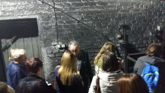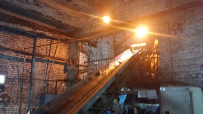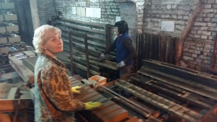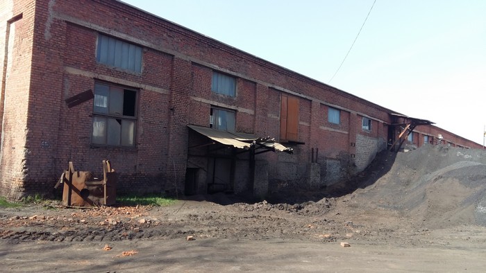 С просторного двора проходим непосредственно в тот самый технологический цех по изготовлению кирпичей. Вот где темнота и спертый, от угольной пыли воздух, что скребет носоглотку, заставляет тебя, в какой-то степени порадоваться, что тебе не приходится работать в таких условиях, а тяжелее ручки и диктофона ничего не держать в руках не доводилось. В тоже время бесконечно жаль людей место работы, которых чем-то напоминает те самые шахты, откуда берется уголь для кирпичей.