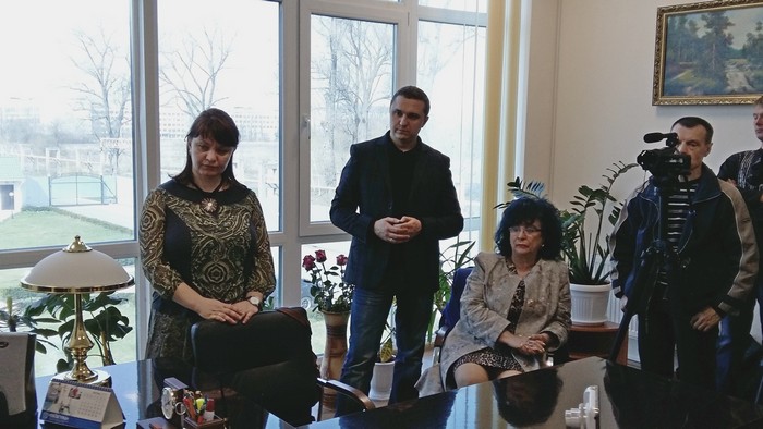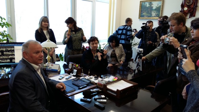 Сам Анатолий Литвин встречает гостей в темно-сером костюме с отливом, белой рубашке, на левой руке массивные часы, а на лацкане пиджака прикреплен значок в форме герба Украины.