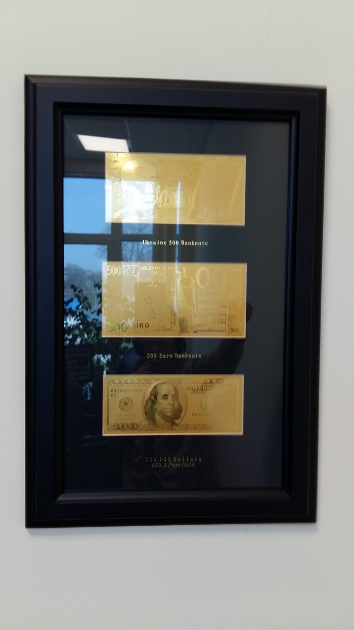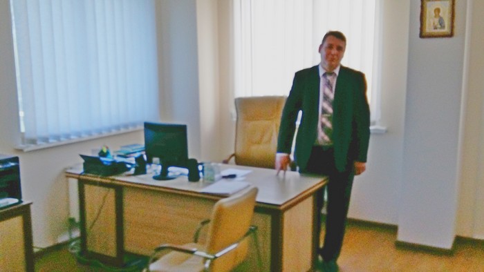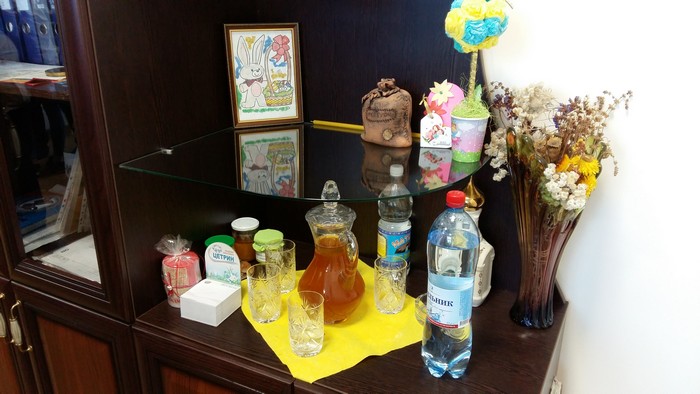 В офисе Литвина два коричневых стола и в тон им директорское кресло, шкаф с книгами и папками, на стенах грамоты и подаренная на день рождения икона отцом Михаилом, механические настенные часы, картина с лесным пейзажем и застекленная рамка с золотыми банкнотами номиналом 500 гривен, 500 евро и 100 долларов. На полочке шкафа разместились 2 бутылки с минеральной водой и стаканами, 3 баночки различного вида меда, арома-свеча в упаковке, букет сухих цветов в вазе светло-коричневого стекла и детский рисунок пасхального кролика.