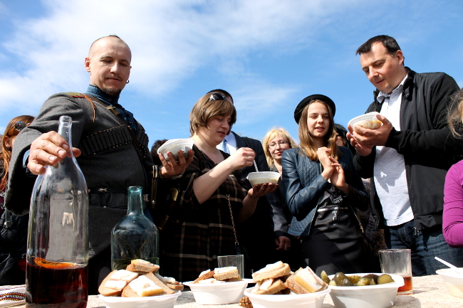 Затем праздник переместился к Екатерининской церкви, где гостей встречали караваем, казацким кулешом, песнями и плясками.