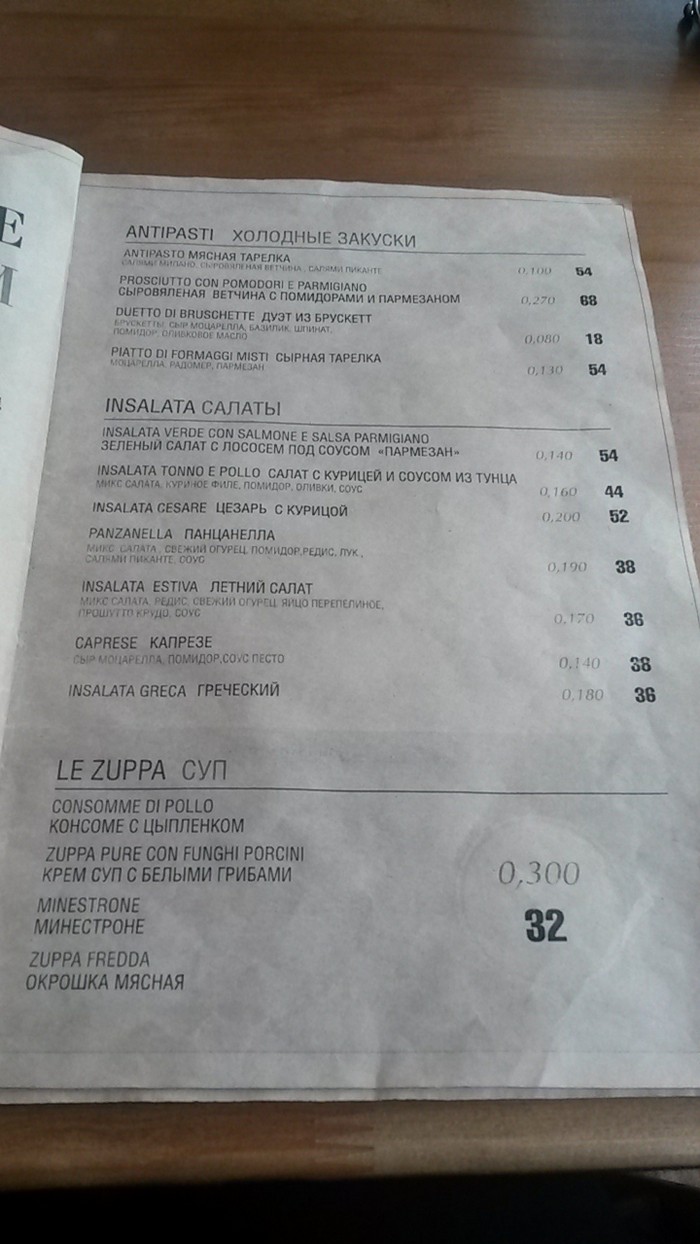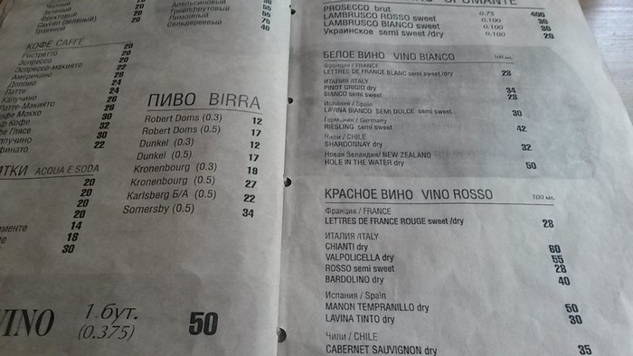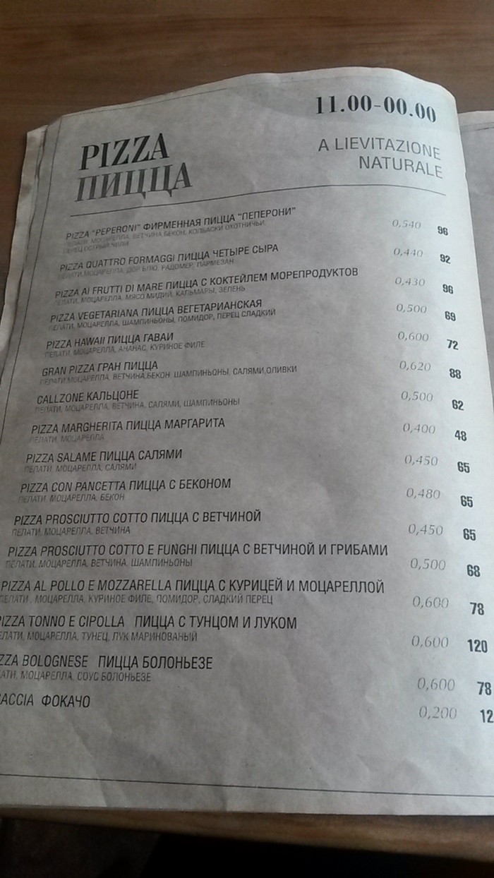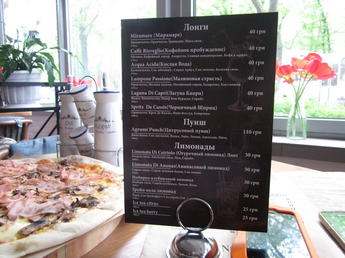 После того, как мы присели за столик, к нам сразу же подошла официантка (без бейджика) и принесла меню. Основное блюдо заведения – конечно же пицца, её здесь аж 15 видов, цены от 48 о 120 грн, также различные виды пасты, десерты, супы, салаты. Алкоголь тоже имеется, красное вино в среднем 40 гривен за 100 миллилитров, пиво от 12 за Robert Doms (0.33) до 27 за Kronenbourg (0.5), сидр Сомерсби – 34 грн.