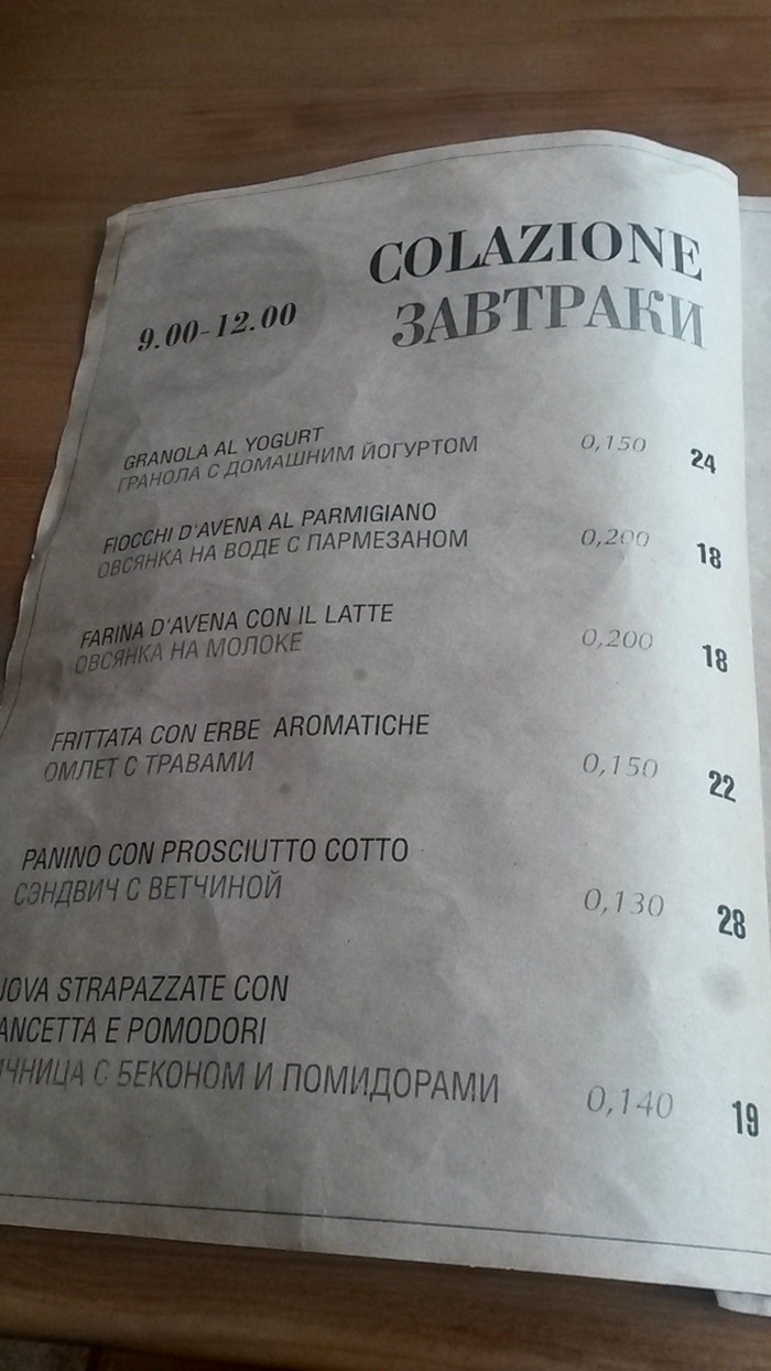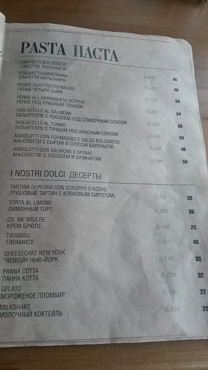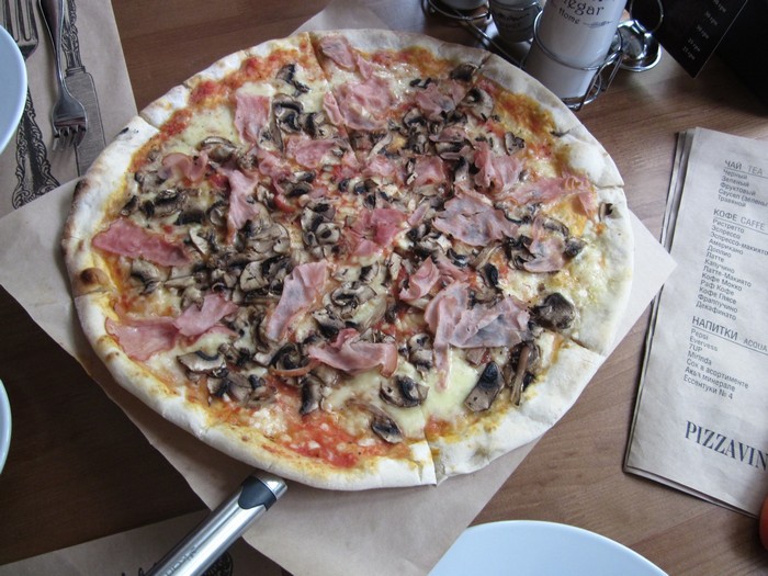 Мы попробовали пасту, вкусная, не переваренная, как положено - al dente. Пицца была с тоненьким тестом, начинки не так и много – по краям пустовато, но во времена кризиса в пиццериях – это тренд. Ветчина порезана тонко слайсами.