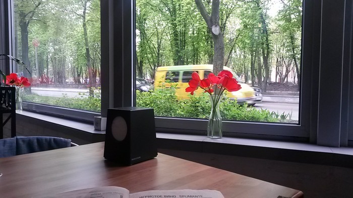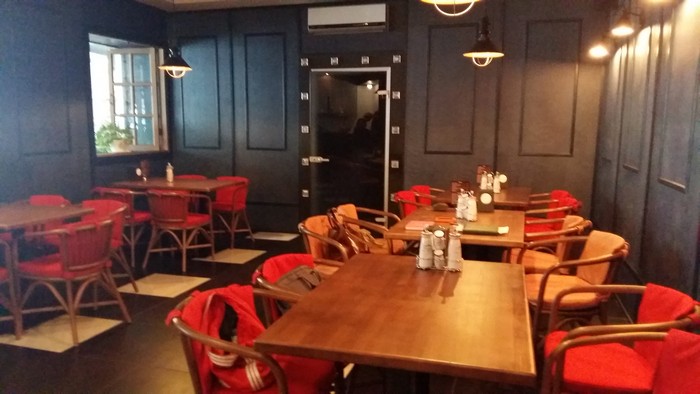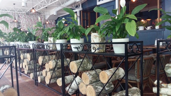 В «Peperoni» мы пришли около 13.00, в зале было немноголюдно, интерьер удивил обилием живых цветов в горшках, а также на подоконниках стояли вазы с тюльпанами. Также на кованых подставках лежали деревянные поленья, видно, что владельцы заведения максимально стремились приблизить его стиль к эко-дизайну, но в целом количество цветов показалось в какой-то мере чрезмерным.