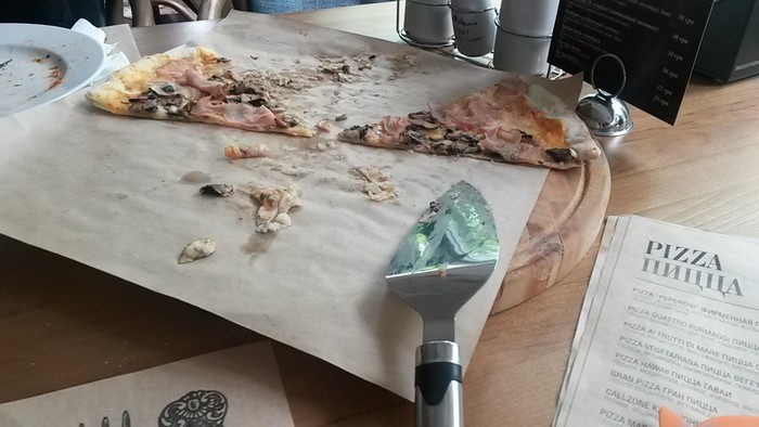 Принесло некоторый дискомфорт, то, что пицца была подана на дощечке с пергаментной бумагой, в результате чего несколько кусочков прилипли к бумаге. Их пришлось буквально «отдирать», что вышло не совсем эстетично.